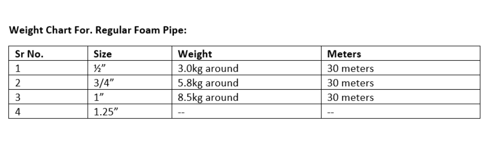 Like the saffron pipe above, this material also has a very smooth finish on the surface of the pipe. But here the characteristics, properties, and nature of the pipe are different. Apart from this, this pipe is also budget friendly. Hence this pipe is named regular foam pipe. Below is the weight chart and photo of this pipe.
