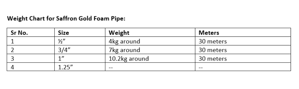 This pipe is a different type of pipe with a different look and feel to the pipe. The specialty of this pipe is that this pipe feels very velvety in hand and its smooth finish and disco properties make it a lot of fun to use. The material of this pipe comes to us in saffron color, so we have given the name of this pipe as Saffron Foam Imported Material Garden Hose. In this pipe, the chances of pipe twisting, kinking, tightening or cracking are negligible. This pipe is recommended for domestic water use. Below is the weight chart and photo of this pipe.